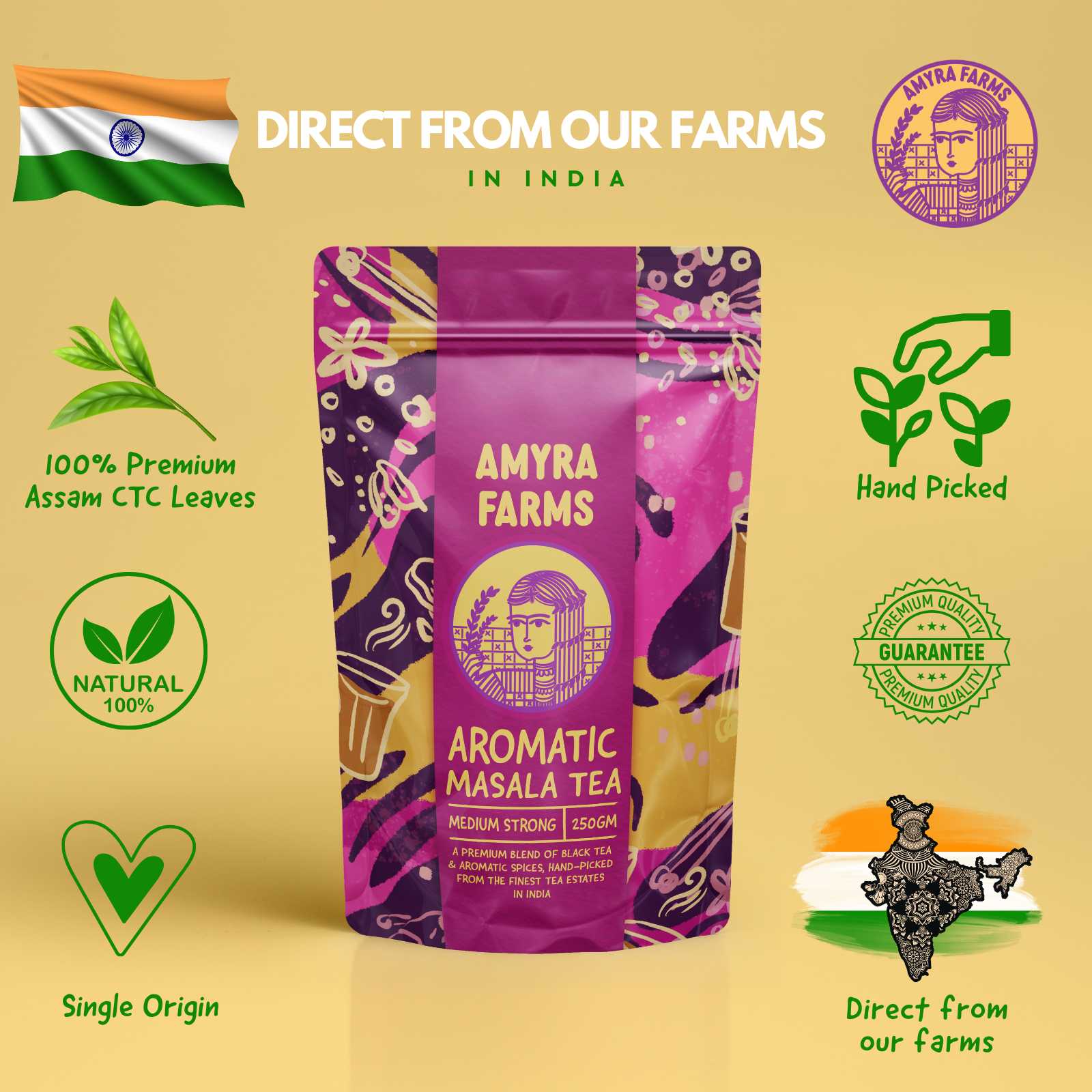 At Amyra Farms, we take pride in sourcing the highest quality ingredients to create our blends. Our Aromatic Masala Chai is made with 100% natural ingredients, with no artificial flavors or preservatives.