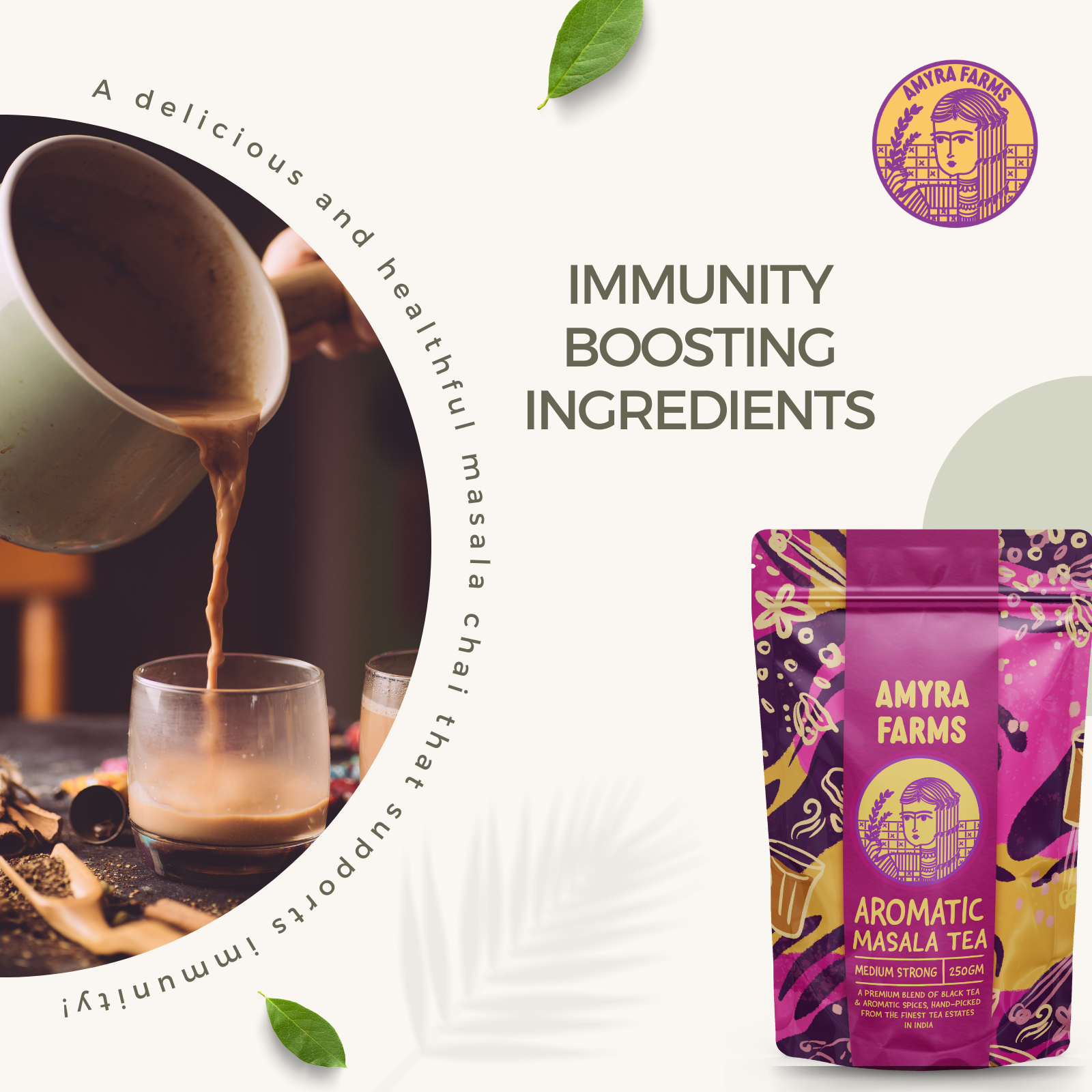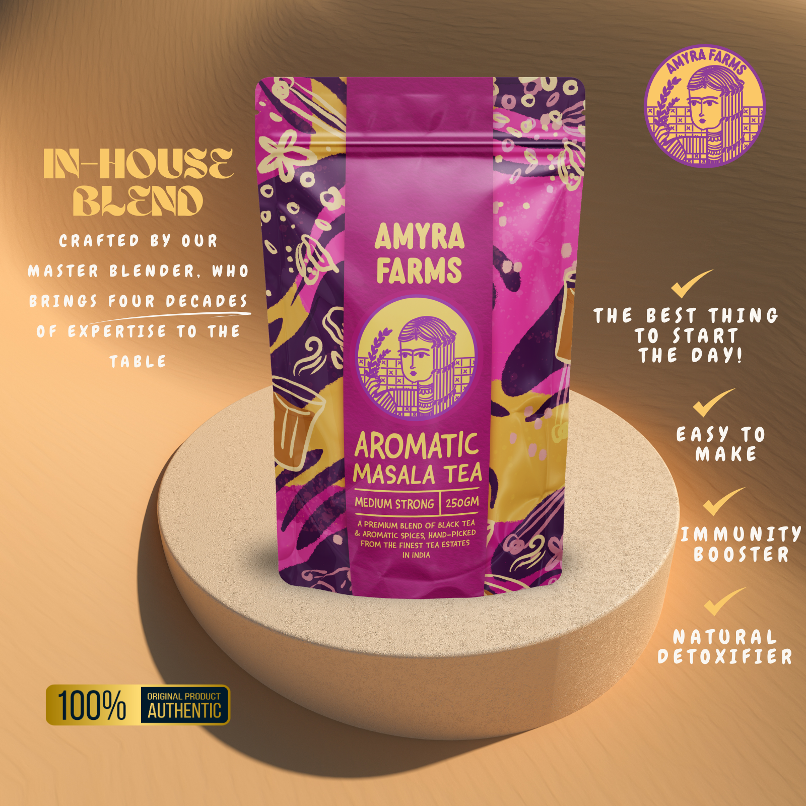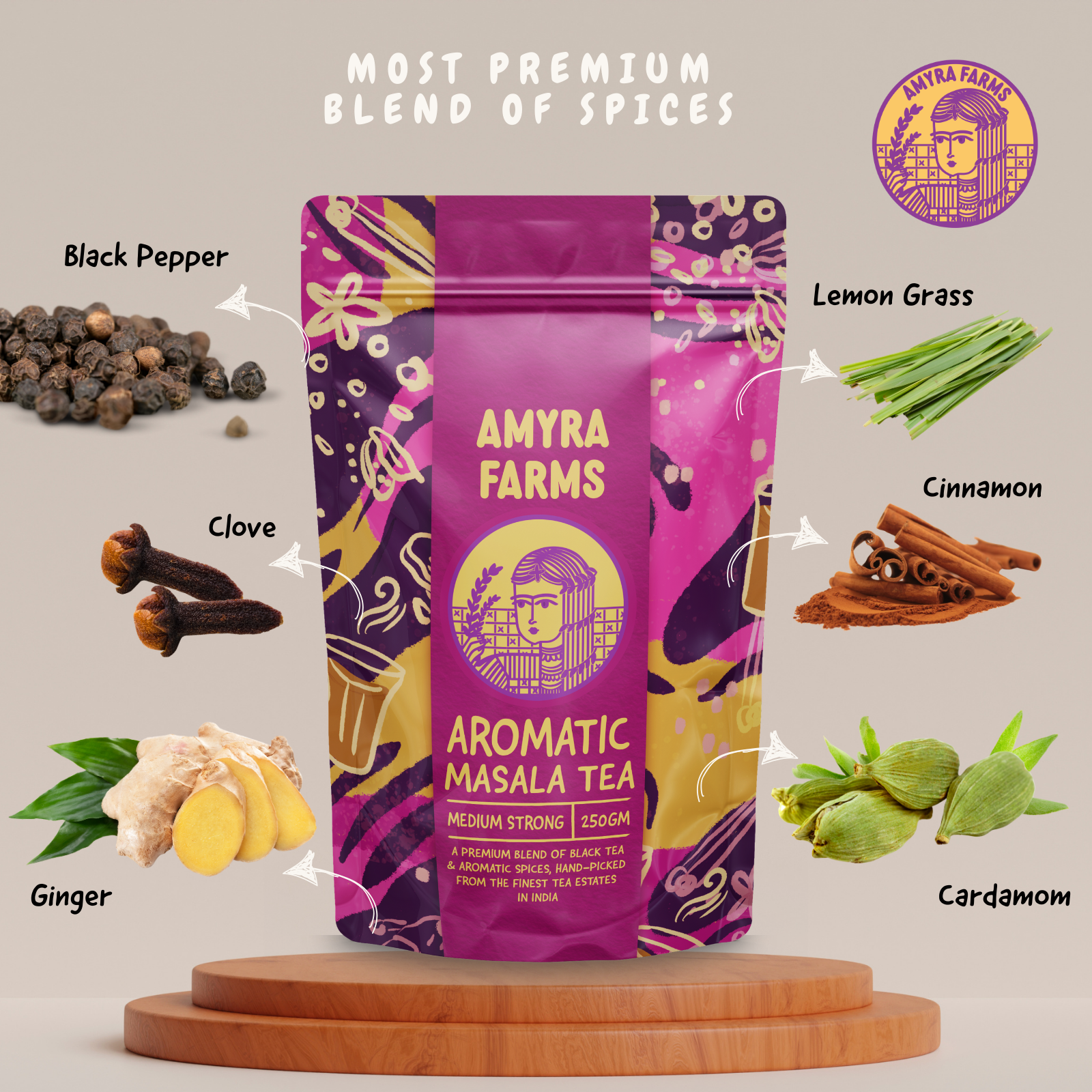 Aromatic Masala Chai by Amyra Farms is a premium blend of black tea and aromatic spices, hand-picked from the finest tea estates in India. The blend is carefully crafted to deliver a rich and flavorful experience with every sip. The bold and warming flavors of the spices, including cardamom, cinnamon, ginger, and clove, are perfectly balanced with the boldness of the tea to create a harmonious taste that is both satisfying and comforting. . .