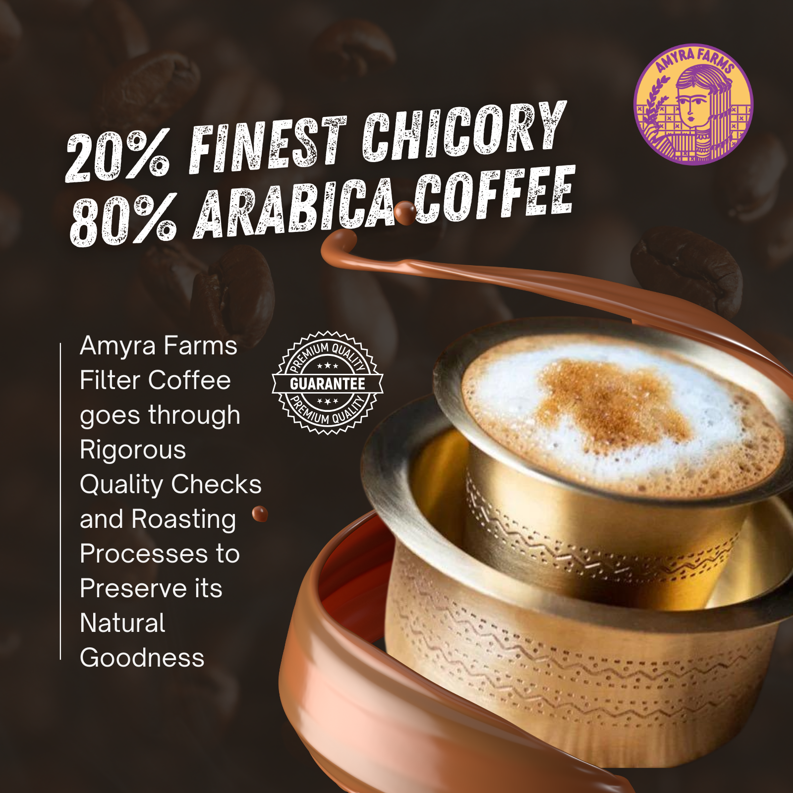 Experience the soul-stirring essence of South Indian Filter Coffee with Amyra Farms Kaapi Blend. Sourced from our very own coffee estate in the lush valleys of Chikmagalur, this exceptional blend is a harmonious marriage of premium coffee beans and 20% chicory powder, meticulously crafted to deliver an authentic and heartwarming coffee experience that is synonymous with the rich cultural heritage of South India. . . .