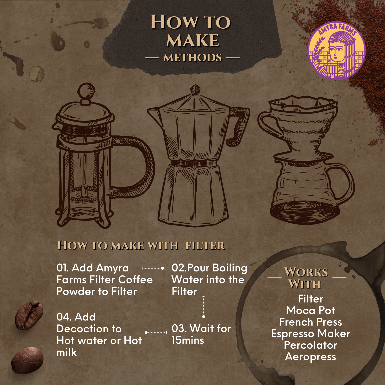 Versatile and Easy to Brew: Whether you prefer to prepare your coffee using a traditional coffee filter or opt for a modern brewing method, Amyra Farms Kaapi Blend adapts seamlessly to your preferences, guaranteeing a consistent and delightful coffee experience every time.
